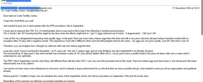 Μια επιτυχημένη θεραπεία Enriched PRP για μια γυναίκα από το Ηνωμένο Βασίλειο που μας εμπιστεύτηκε και επισκέφθηκε την κλινική μας το καλοκαίρι του 2025. Το Κέντρο Γονιμότητας Κρήτης έχει βελτιώσει τη θεραπεία αναζωογόνησης των ωοθηκών εφαρμόζοντας τη μέθοδο Enriched PRP με πιο σημαντικά αποτελέσματα σε γυναίκες με πρόωρη εμμηνόπαυση. Αυτό αποδεικνύεται από τις συνεχείς