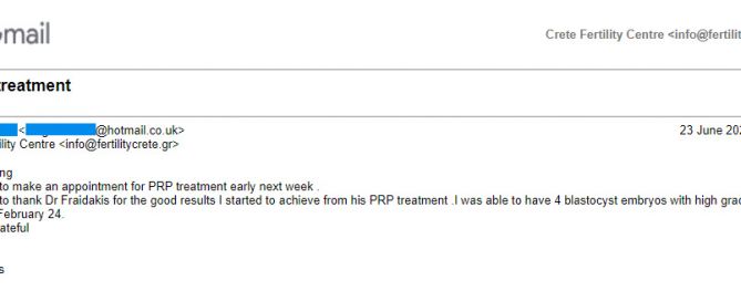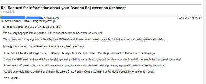 A successful Enriched PRP treatment for a Saudi Arabian woman who visited our clinic. Crete Fertility Centre has improved the classic ovarian rejuvenation process offering the Enriched PRP with more significant results to women with early menopause. The greeting message Hello Popi, I wanted to share my good news with you. I was